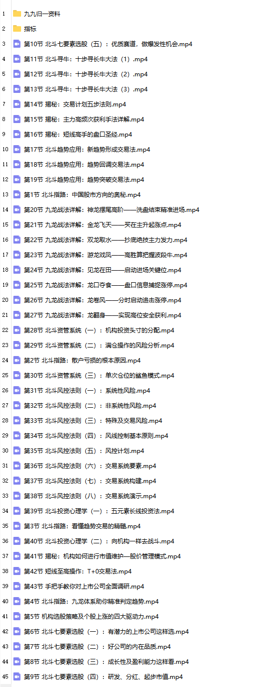 第1节北斗指路:中国股市方向的奥秘.mp4 第2节北斗指路:散户亏损的根本原因.mp4 第3节北斗指路:看懂趋势交易的精髓.mp4 第4节北斗指路:九龙体系助你精准判定趋势.mp4 第5节机构选股策略及个股上涨的四大驱动力.mp4 第6节北斗七要素选股(一):有潜力的上市公司这样选.mp4 第7节北斗七要素选股(二):好公司的内在品质.mp4 第8节北斗七要素选股(三):成长性及盈利能力这样看.mp4 第9节北斗七要素选股(四):研发、分红、起步市值.mp4 第10节北斗七要素选股(五):优质赛道,做爆发性机会.mp4 第11节北斗寻牛:十步寻长牛大法(1).mp4 第12节北斗寻牛:十步寻长牛大法(2).mp4 第13节北斗寻牛:十步寻长牛大法(3).mp4 第14节揭秘:交易计划五步法则.mp4 第15节揭秘:主力高频次获利手法详解.mp4 第16节揭秘:短线高手的盘口圣经.mp4 第17节北斗趋势应用:新趋势形成交易法.mp4 第18节北斗趋势应用:趋势回调交易法.mp4 第19节北斗趋势应用:趋势突破交易法.mp4 第20节九龙战法详解:神龙摆尾高阶——洗盘结束精准进场.mp4 第21节九龙战法详解:金龙飞天——买在主升起涨点.mp4 第22节九龙战法详解:双龙取水——抄底绝技主力发力.mp4 第23节九龙战法详解:游龙戏凤——高胜算把握波段牛.mp4 第24节九龙战法详解:见龙在田——启动进场关键位.mp4 第25节九龙战法详解:龙口夺食——盘口信息捕捉涨停.mp4 第26节九龙战法详解:龙卷风——分时启动追击涨停.mp4 第27节九龙战法详解:龙翻身——实现高位安全获利.mp4 第28节北斗资管系统(一):机构投资头寸的分配.mp4 第29节北斗资管系统(二):满仓操作的风险分析.mp4 第30节北斗资管系统(三):单次仓位的鲨鱼模式.mp4 第31节北斗风控法则(一):系统性风险.mp4 第32节北斗风控法则(二):非系统性风险.mp4 第33节北斗风控法则(三):特殊及交易风险.mp4 第34节北斗风控法则(四):风线控制基本原则.mp4 第35节北斗风控法则(五):风控计划.mp4 第36节北斗风控法则(六):交易系统要素.mp4 第37节北斗风控法则(七):交易系统构建.mp4 第38节北斗风控法则(八):交易系统演示.mp4 第39节北斗投资心理学(一):五元素长线投资法.mp4 第40节北斗投资心理学(二):向机构一样去战斗.mp4 第41节揭秘:机构如何进行市值维护—股价管理模式.mp4 第42节短线至高操作:T+0交易法.mp4 第43节手把手教你对上市公司全面调研.mp4 九九归一资料 《九九归一》赠送资料——《交易计划的制定》.pdf 《九九归一》赠送资料——《交易计划之正确设置止损》.pdf 《九九归一》赠送资料——《交易计划之正确设置止盈》-.pdf 打分表.png 中枢形态初次筛选方法-1.pptx 指标教程 手机导入tn6指标方法.pdf 手机导入指标使用教程.pdf 通达信指标安装方法.doc 通达信指标安装方法_0125224544.doc 通达信指标的导入和调用.docx 指标安装电脑版.mp4 指标使用说明.docx 指标 1.北斗全套(神龙摆尾筹码动向底部警示心理基准线心里极限空中飞仙蜻蜓点水百宝买卖建仓派发).tn6 2.蜻蜓点水选股(北斗两版本).tn6 百宝买卖(密码666666).tn6 百宝买卖使用说明.docx 北斗老师指标合集(神龙摆尾、筹码动向、底部警示、心理基准线、空中飞仙)20230801.tn6 北斗指标安装电脑版.mp4 筹码动向.tn6 筹码动向(又称仙翼).txt 筹码动向使用说明.docx 底部警示密码888888.tn6 建仓派发2024-3-161137531.tn6 建仓派发使用说明2024-3-16113681.docx 空中飞仙选股公式.txt 空中飞仙.tn6 空中飞仙选股.tn6 蜻蜓点水(副图+选股).tn6 蜻蜓点水副图指标-密码bd1.tn6 神龙摆龙选股.txt 神龙摆尾副图.txt 神龙摆尾介绍.docx 神龙摆尾选股.tn6 神龙摆尾主图+副图+选股.tn6 神龙摆尾主图.txt 心里极限.tn6 心理基准线.tn6 心理基准线使用说明.docx
